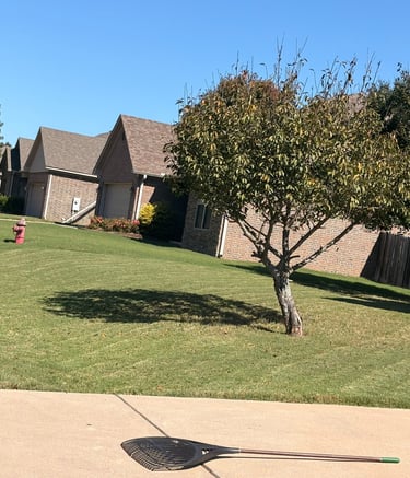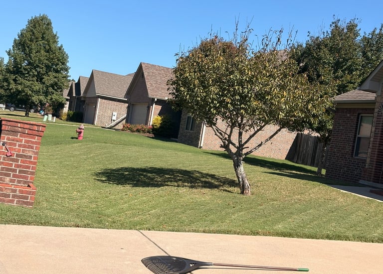 Tackling overgrown grass and scattered leaves with care.